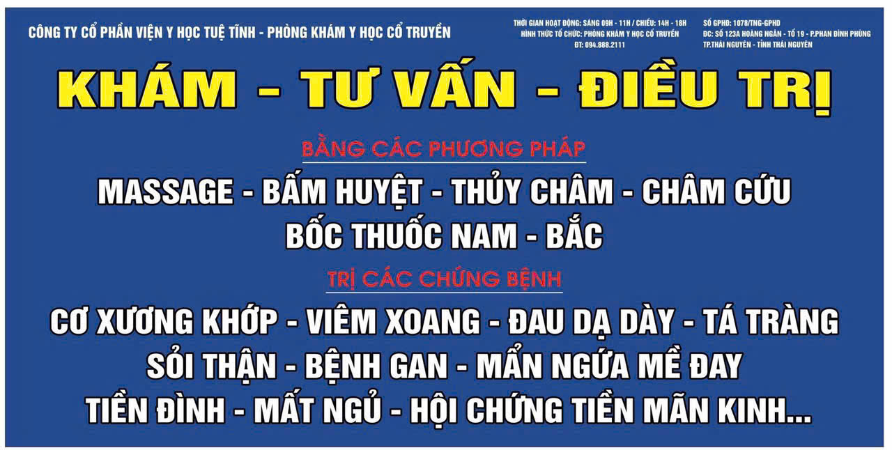 Phòng khám y học cổ truyền Tuệ Tĩnh chuyên khám, tư vấn và điều trị các chứng bệnh về: Cơ xương khớp, viêm xoang, đau dạ dày, gan, sỏi thận, mất ngủ, u hạch... Bằng các phương pháp như massage, bấm nguyệt, thủy châm, châm cuwus, bốc thuốc nam - bắc.