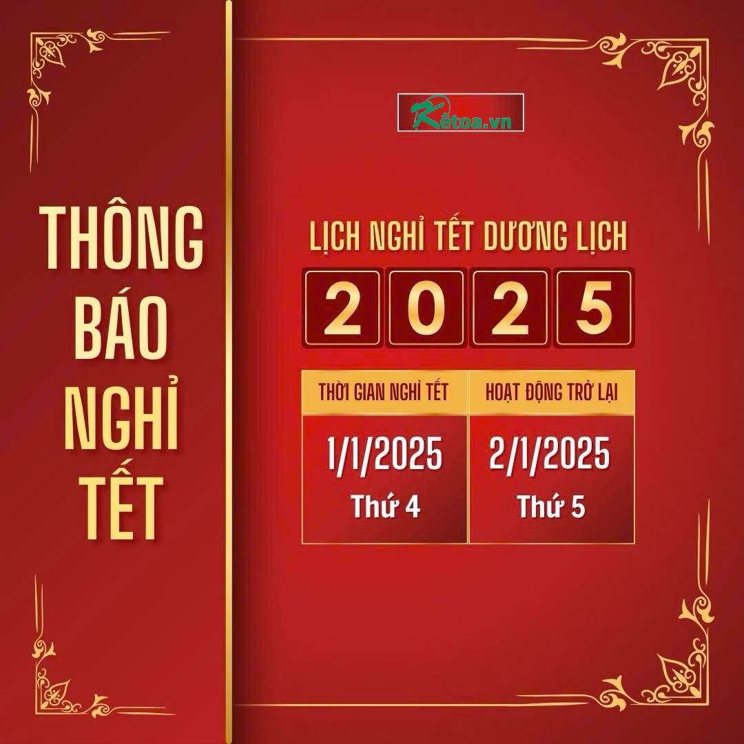 Để thuận tiện cho việc phục vụ và hỗ trợ Quý khách hàng trong dịp Tết Dương lịch 2025, Ketoa xin thông báo lịch nghỉ lễ như sau: